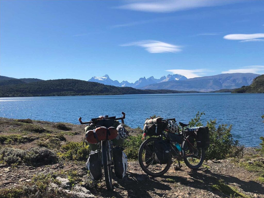 We head off and within two miles cycling into a headwind I’m wondering if it’s ok just to look at YouTube videos instead! But we persevere and after twenty miles we turn a corner and catch a glimpse of the magnificent range. The sun is shining, the road is quiet and it’s a beautiful sight. Another twenty miles and we’ve arrived at a perfect wild camp, down at track to the side of the lake overlooking the towers. It’s stunning, and there’s no one else around! I can’t quite believe our luck, if this was the Lake District we’d most certainly be sharing this view with others!