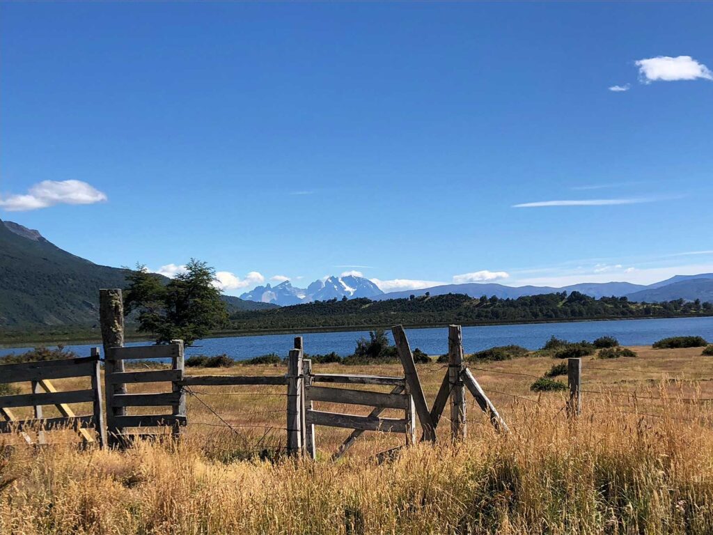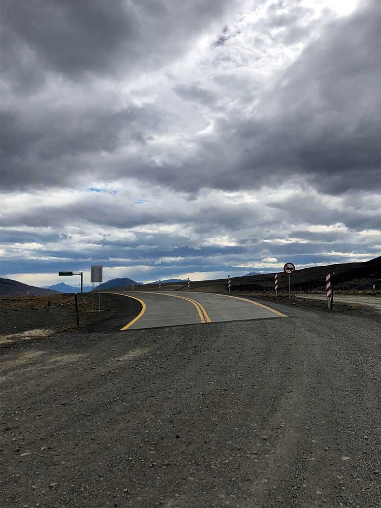 We wake up and set off very early the next day, keen to get the miles done before the afternoon winds arrive. It’s a stunning calm morning, the sky clear shades of red as the sun rises. We ride in silence, gloves and coats on until it warms up. We see many guanacos, ostrich, wild horses and pink flamingos. Eventually Torres Del Paine can be seen in the distance, it looks impressive. It’s another long day, but the winds are calmer and the sun shines. We cross the border once again into Chile and descend a lovely tarmac road into the tiny village of Cerro Castillo. At the Argentinian/Chilean border the road turns from dirt track to perfect smooth tarmac, we stop and take a picture as it looks quite comical. Cerro Castillo is a quiet remote village, one road leading south to Puerto Natales, the other leading into Parque National Torres Del Paine. We had originally hoped to follow the latter road and do a loop through the National park ending in Puerto Natales. But the forecast isn’t looking great with more strong gusts so we decide to head straight to Puerto Natales and wait for good weather, before heading north maybe for a day trip to see the famous towers.