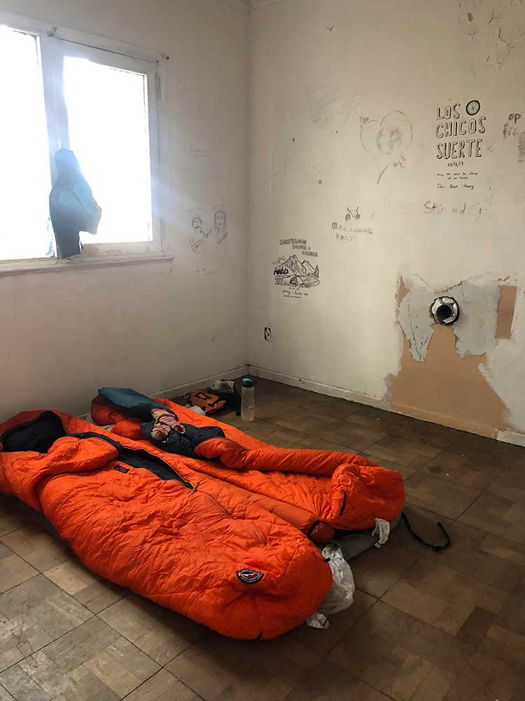 Eventually we do leave, and head on our way, continuing south towards Torres Del Paine. The weather forecast is a bit mixed, but the wind looks in our favour so we go for it. The first 40 miles are unbelievable, with a really strong headwind it feels like we’re flying, we float along the road at 25mph, we’re even pushed up a long winding hill without making much effort. It feels so good. But at the top of the hill we turn direction and suddenly we’re in a crosswind. I’ve never felt a force like it! I’m barely able to keep the bike upright, and keep getting pushed into the middle of the road and across the other side, completely losing control. I’ve no idea if there are any cars or buses behind me and I’m lucky there weren’t as I would have had no chance! At one point it’s so strong I have to get off and push but even then it’s so strong it’s forcing me into the road until I have to drop the bike just to stay upright. The bike does a somersault and flies down the ditch at the side of the road and I quickly follow! It’s really terrifying, particularly as there’s no where to get any shelter, we’re on an open plain. We eventually drop down into the ditch and walk and cycle for some time until we turn the corner slightly. We pass an overturned trailer, the owners standing beside looking shocked. It shocks and scares me too. Eventually we can cycle again but even then the occasional gust has me veering into the road. It’s certainly not an experience I’d like to repeat, and really gives me a feel for the famous Patagonian winds. That day we do 74 miles as there is no shelter until we find an abandoned police station to camp in. It’s been used by several cyclists in the past and it’s fun to read and look at their wall art. We add our own. There’s also another cyclist there from Uruguay and two more turn up later on. Exhausted, we eat early then I fall into a deep sleep!