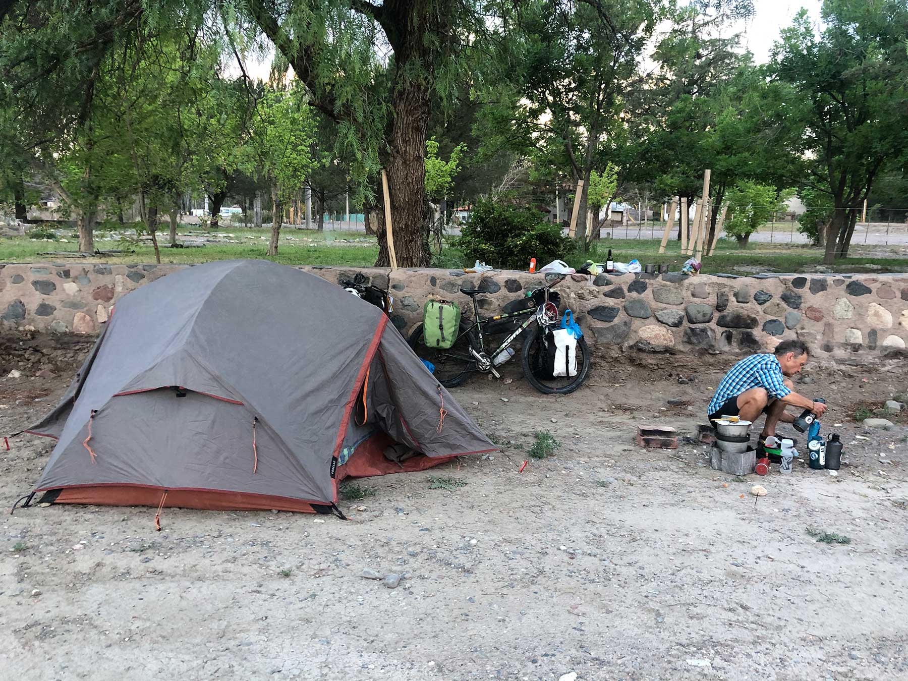It’s such a nice night we pitch just the inner tent and camp under the stars. It’s stunning looking up at the thousands of stars from the tent, but the wind picks up in the night and wakes us up blowing through the tent. The next day there is a real headwind all day making the 35 miles uphill really hard work. It’s so bad it becomes known as the ‘effing wind’. We eventually arrive at Puenta del Inca, a small ski village with some thermals and colourful rock. We find a campsite, and meet retired English couple, Pete and Sandy who now live in Spain, and are travelling around Argentina in a campervan for the month. They’re good fun, they also cycle a lot, and we swap stories. But of course we drink too much red wine! It’s cold for the first time in so long I can’t remember, and we fish out our trousers and down jackets! But once again it’s a stunning clear night sky, the white snowy peaks illuminated by the thousands of bright stars above. The tent zip has finally had it so I sleep with one eye and ear open, looking out for lurking insects!