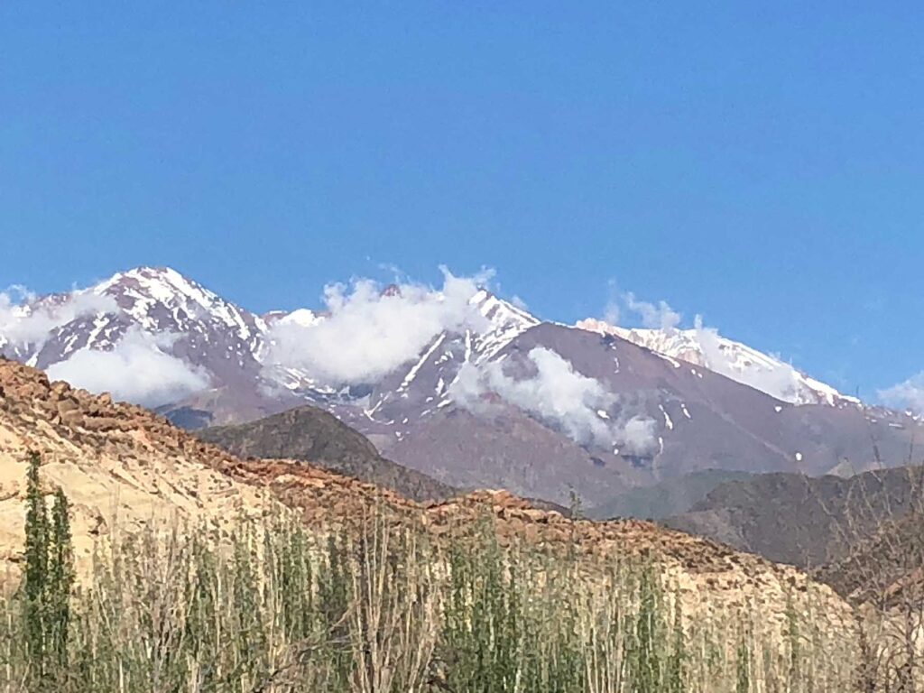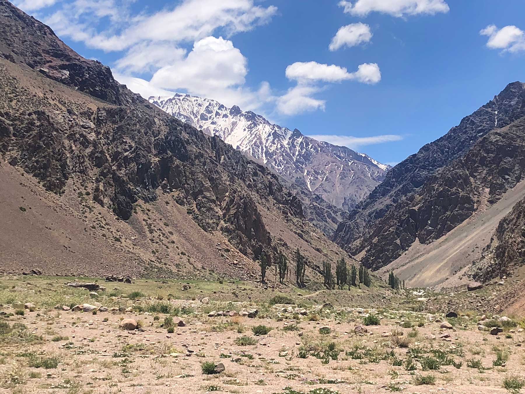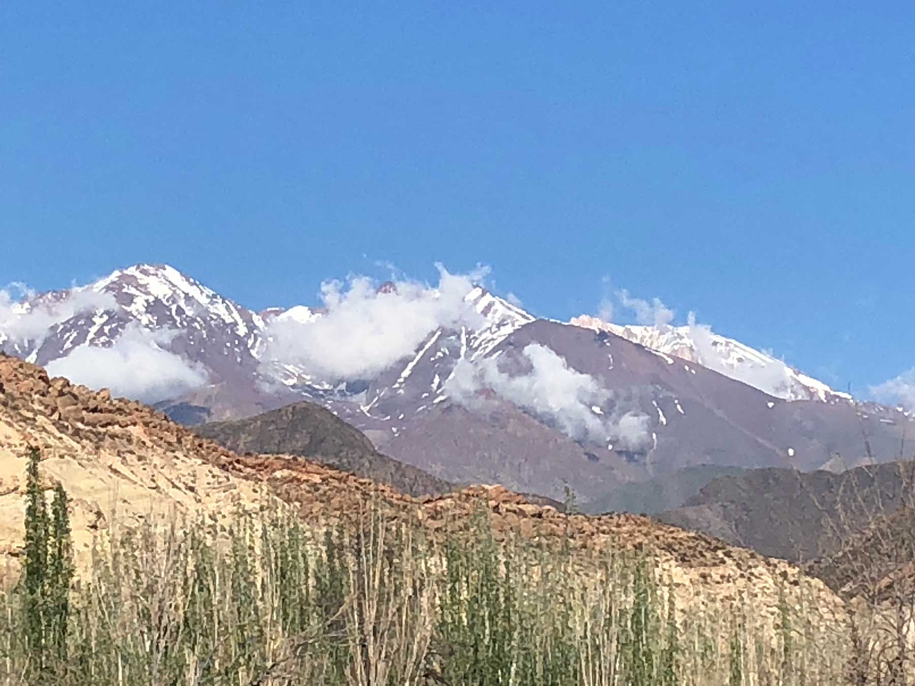 We eventually leave the comfort and convenience of Mendoza, bikes fully laden once again. We cycle out of the city before we start to climb steadily uphill towards Paso International Los Libertadores, a route that will take us to 3800m high and three days to climb. We get views of snowy mountains under a blanket of white clouds as we start to climb, and I feel excited to be heading over the Andes again.