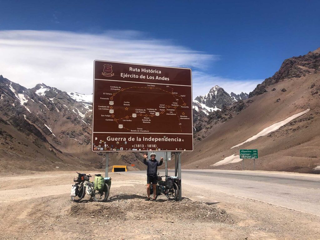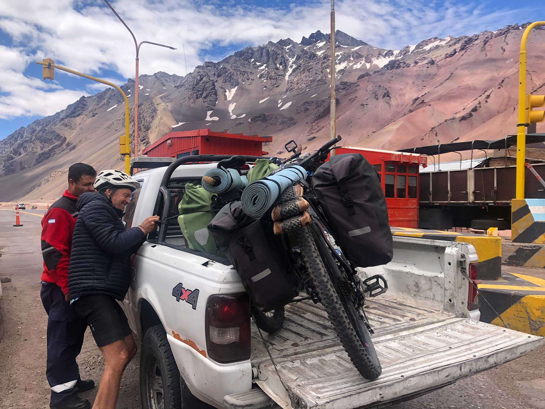 The morning is chilly as we pack up and say goodbye to Pete and Sandy, who are off to hike up to Aconcagua’s base camp. We climb uphill for the last ten miles (into effing headwind of course) before finally reaching the tunnel which separates the two countries. It’s pretty cold as we cycle the last few miles, and we sit in our down jackets munching on the last of our nuts and fruit as we’re not allowed to take any of this into Chile. We had wanted to go off road up to the top of old pass where the Christ the Redeemer monument is, but it was closed due to too much snow. So we had to wait for a truck to take us through the tunnel as cyclists are not allowed through. We heave our bicycles onto the back of a pick up truck and an official drives us through. Half way through we pass a ‘Bienvenidos i Chile’ sign and soon we pop out of the dark tunnel and into Chile.