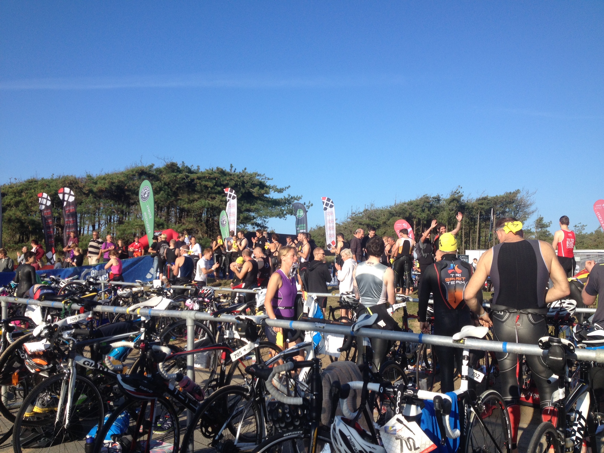 Today I’m competing (or rather taking part!) in the Sandman sprint triathlon in Newborough, Anglesey. It’s early, but already I know it’s going to be a beautiful day. It’s so clear, and as soon as the sun rises, the morning chill which by now has turned my feet into ice blocks, will disappear and hopefully I’ll thaw!