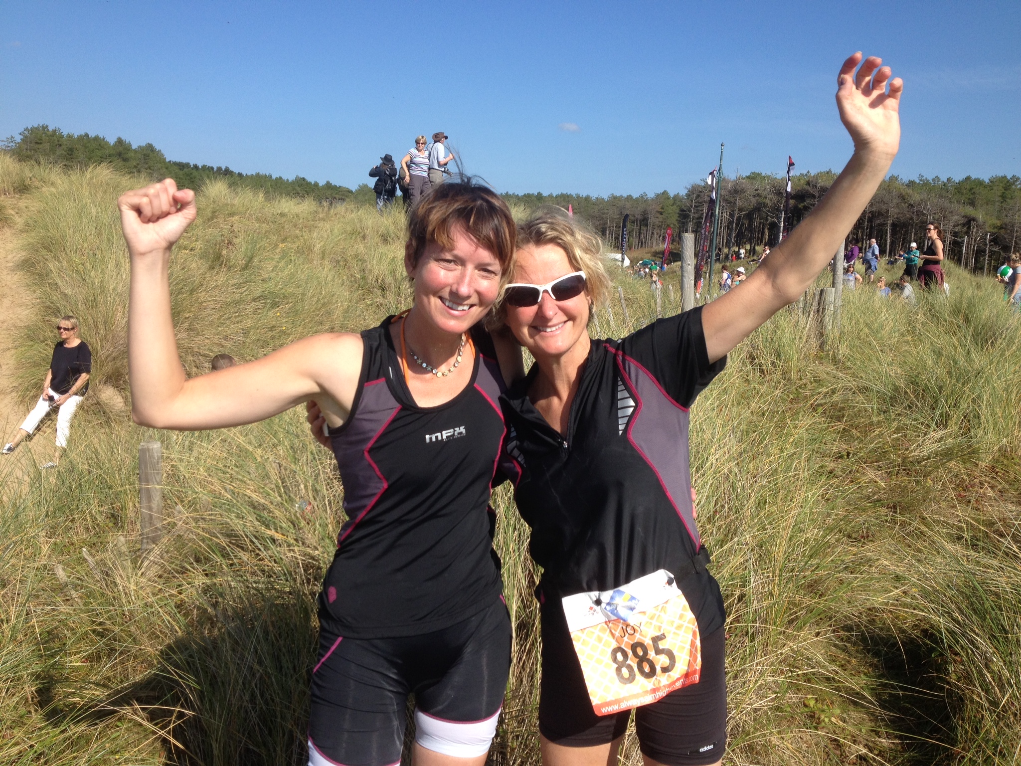 We hit the halfway water point and I managed to drink some water whilst still partially moving. I was struggling now and started to wonder why time after time I put myself through these things! Joy is ahead and could go so much faster but she patiently waits for me to catch up. We finally hit the sand dunes and I have to gather all the energy I have left to climb the steep sand dune and drop down onto the beach for the final 750m run. There are crowds of supportive people cheering us on and in the distance I can see the heavenly sight of the two blue flags that signifies the turn off from the beach to the finish line.